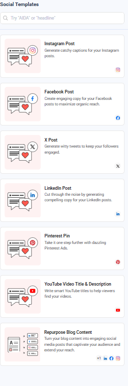 You still get ad and social templates, but the platform feels more at home in blog and landing-page workflows than Anyword does.