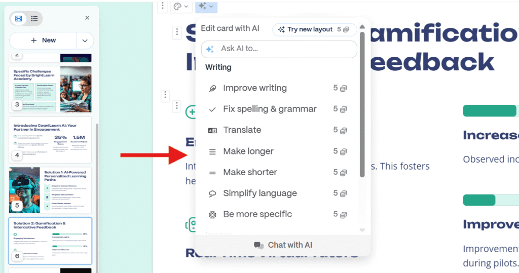 - Card-based layout and swift editing: Gamma uses “cards” (akin to slides or content blocks) allowing you to rearrange, edit and regenerate sub-sections easily.