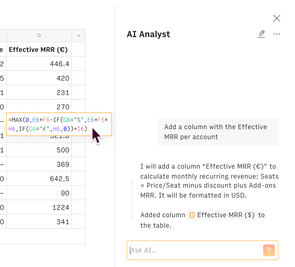 - Natural-language AI cells: Instead of writing formulas, you type something like