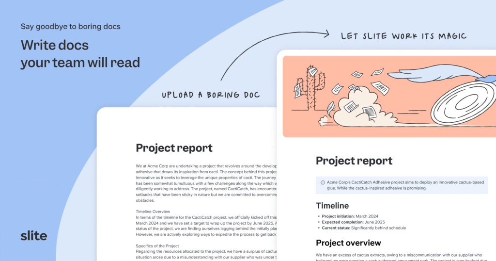 - Readability: Because Slite’s AI emphasizes readability and audience awareness (“write to your readers,” “use sub-headings and bullets”), your final report is more accessible and less corporate-boilerplate.