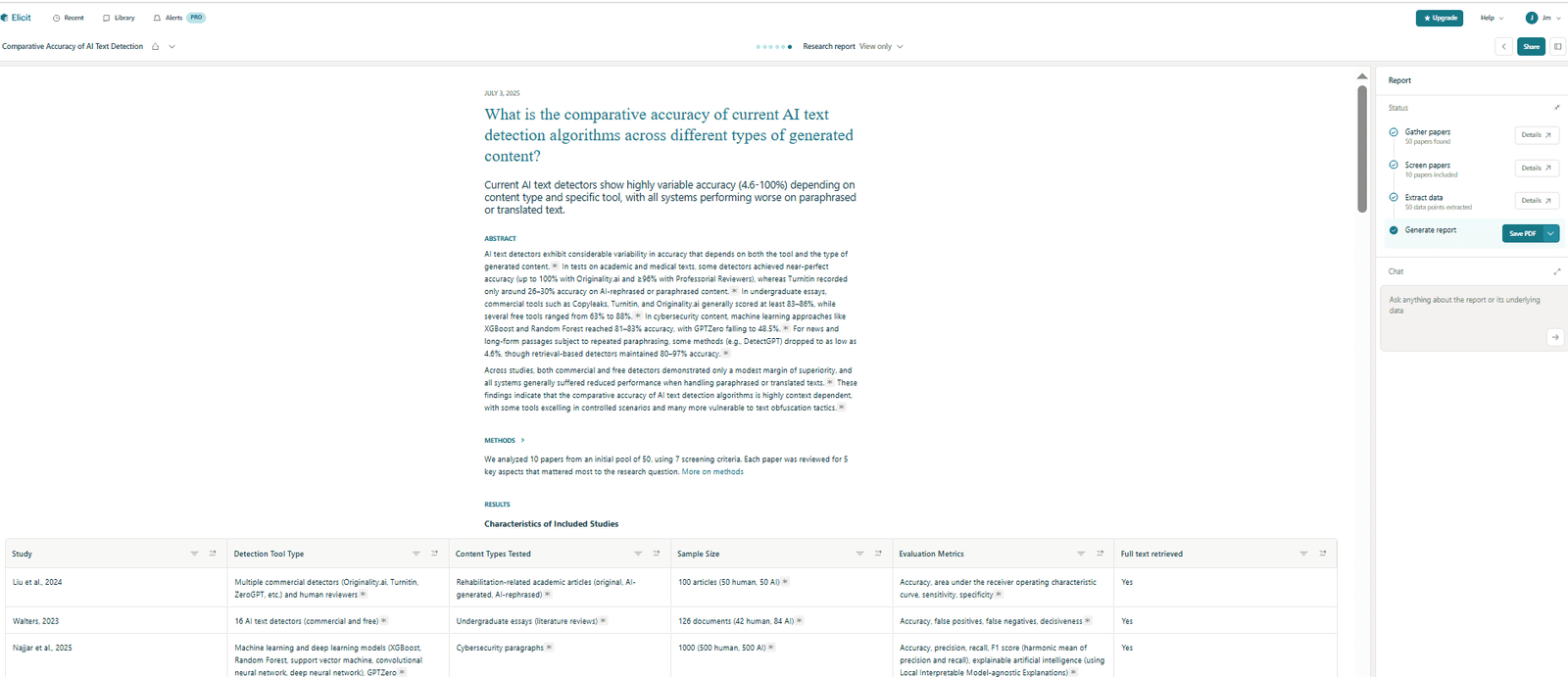 That selectivity has benefits. The papers included were tightly aligned with the prompt, and the report stayed focused on quantitative comparisons—accuracy ranges, false positives, and performance metrics—rather than broad narrative discussion. For example, it explicitly surfaced accuracy figures for AI detection tools ranging roughly from the mid-50s to the high-90s, which is exactly what I was looking for.