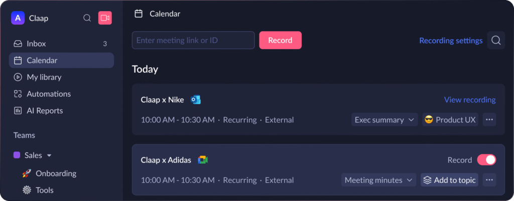 Claap est une plateforme française dédiée à la création de vidéos complétée par une transcription automatique, un résumé IA, des commentaires horodatés et des intégrations aux outils métiers. Elle se positionne moins comme simple « prise de notes d’appel » que comme un espace de travail vidéo asynchrone basé sur l’IA.