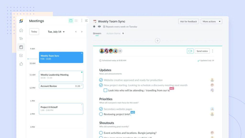 Équipes qui veulent relier agenda, notes partagées et tasks avec IA | Transcription & résumé IA, agendas collaboratifs, assignation d’actions, historique & analytics, intégrations (Google/Microsoft/Slack/CRM) | Free · Pro/Team ≈ $7/util./mois (annuel) · Business ≈ $15/util./mois · Enterprise ≈ $25+/util./mois |