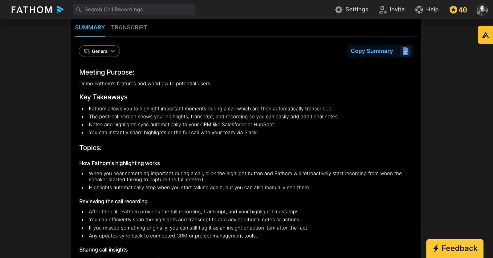 • Transcription automatique en temps réel ou après l’appel, avec reconnaissance des locuteurs. Comme l’indique un utilisateur : « Fathom a capturé les points d’action et les a assignés automatiquement ».