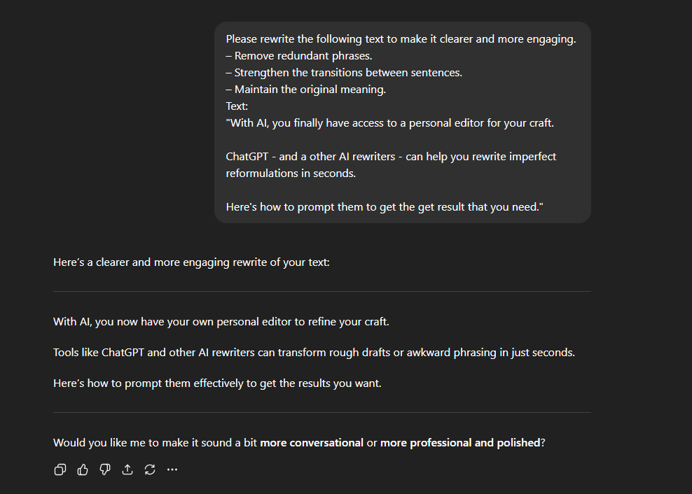 - Full-sentence rewrites: you can ask it to rewrite a sentence or paragraph for clarity, conciseness or tone.